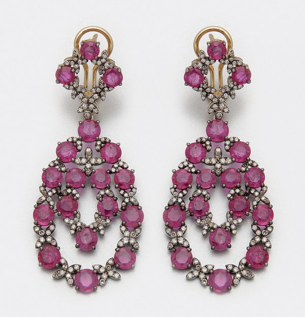 Paar russische Rubin-Pendeloques Gelbgold, gest. 56 (583), teilw. mit Silber verbödet. Schauseitig besetzt mit pinkfarbenen Rubinen von zus. ca. 17 ct., akzentuiert durch kleine Diamanten von zus. ca. 1,50 ct.; Ges.-Gew. ca. 15,30 g.