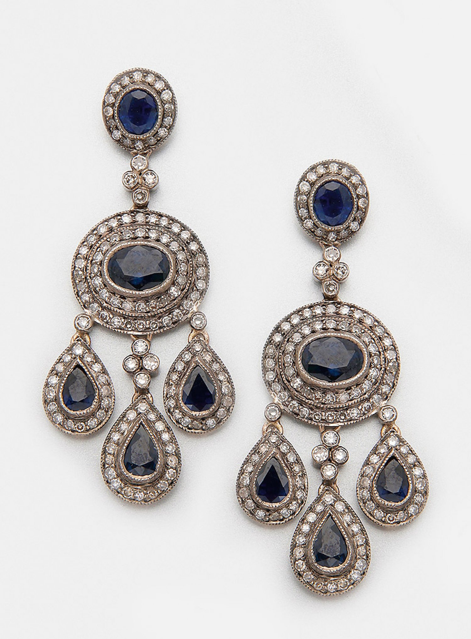 A pair of Russian earrings set with sapphires approx. 5,50 ct. and diamonds approx. 2,50 ct., in 14 k gold and silver.