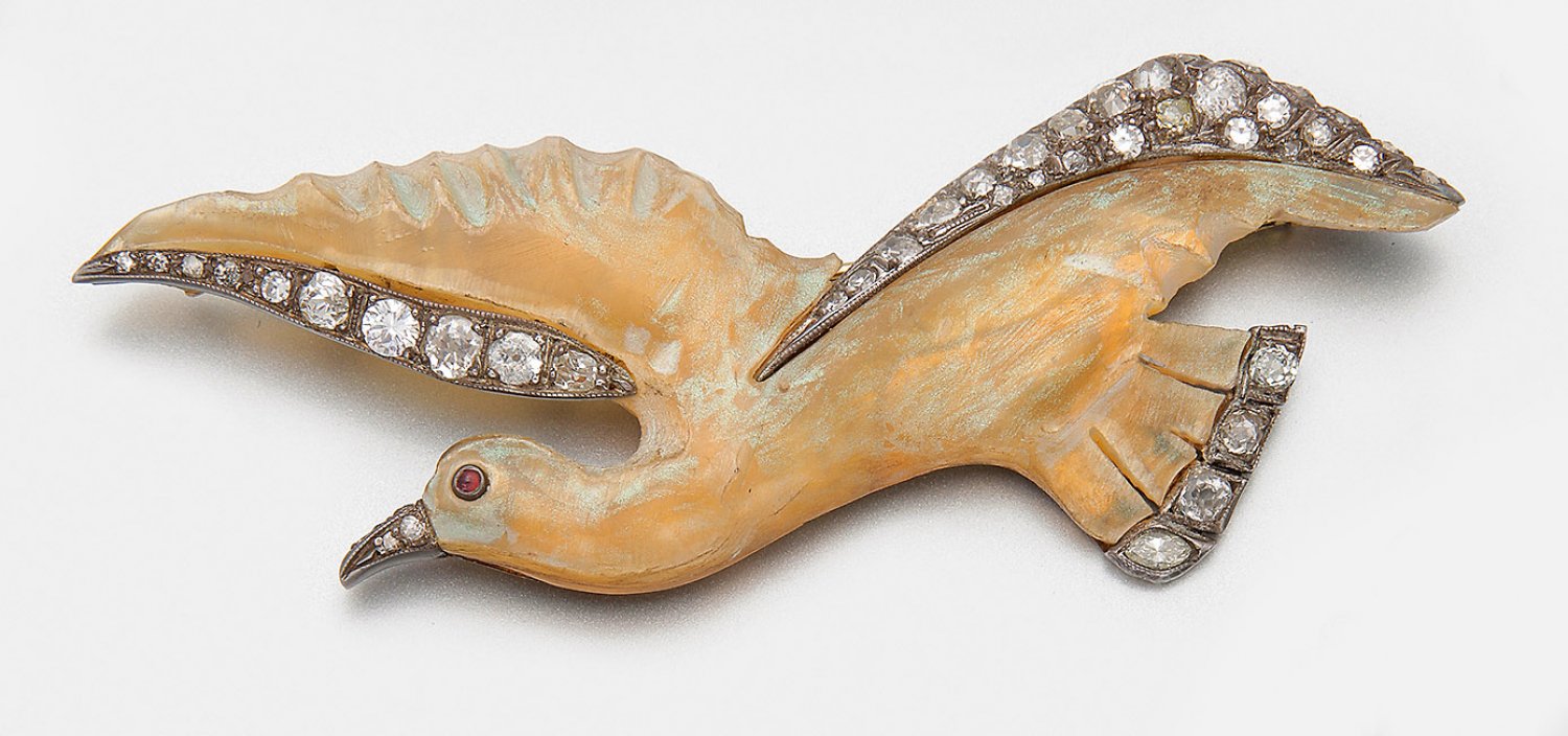 Jugendstil-Diamantbrosche-"Möwe" Gelbgold; 14 ct.; Geschnittener, transparenter, leicht erisierender Calcit, akzentuiert durch Diamantrosen von zus. ca. 1,50 ct.; Gew. 17,13 g.