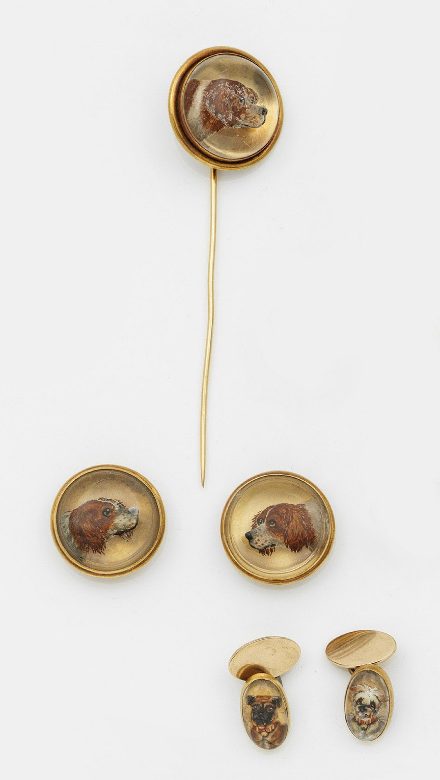 Paris um 1900 Crystal Essex-Parure von Edouard Leclerc, Paris um 1900 Gelbgold, gest. 750, französischer Garantie-Stempel sowie Roségold 14 ct.; Paar Frackknöpfe, Plastronnadel und ein paar Manschettenknöpfe mit Darstellungen von Jagdhunden, Mops sowie Terrier in polychrom bemalter Intaglio-Technik in Bergkristall. Ges.-Gew. ca. 42,30 g. Originales Samt-Etui.