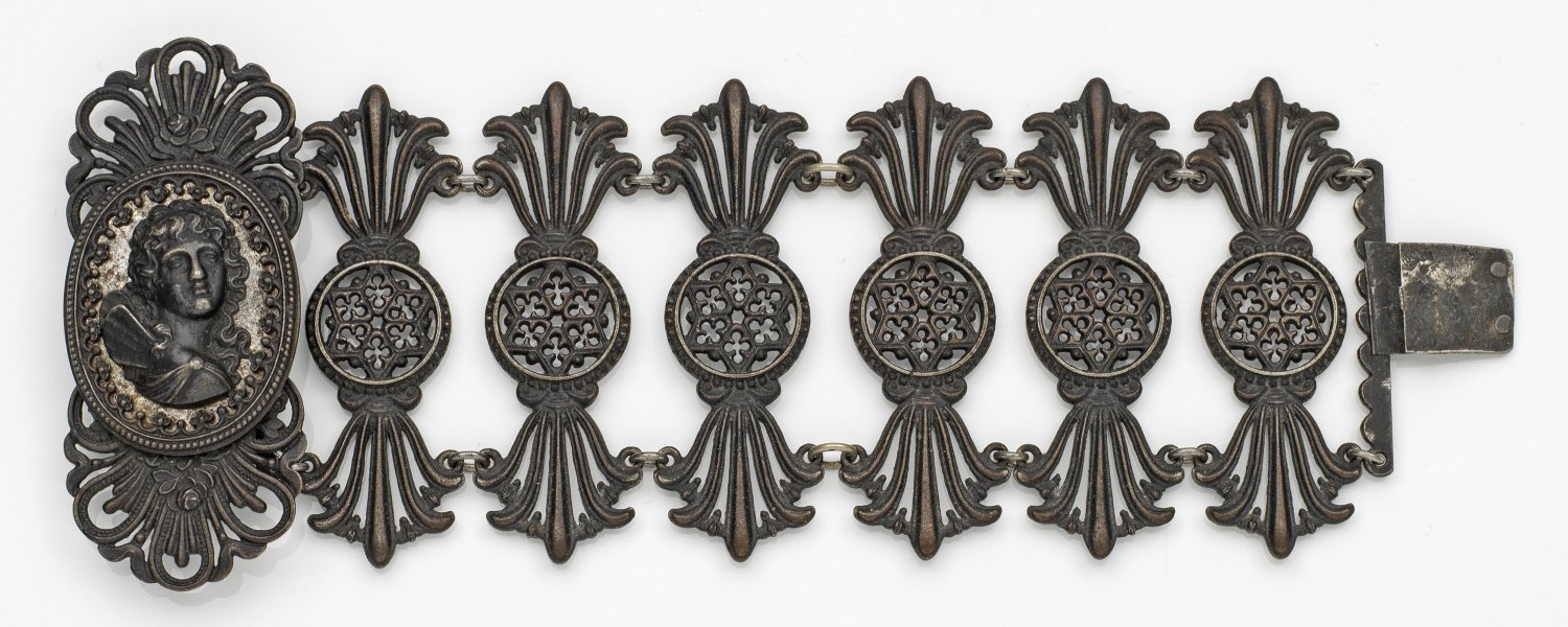 Armband sog. "Berliner Eisen". Eisenguss, Stahl, schwarz gebrannt. Gliederarmband bestehend aus einem Verschlussstück und sechs durch Ringe verbundene, durchbrochen gearbeitete Glieder in Form von stilisierten Palmetten und Sternen. Verschlussstückmitte hochoval besetzt mit reliefplastischer, weiblicher Büste, wohl Psyche darstellend. Ringe teilw. ersetzt. L. 18 cm.