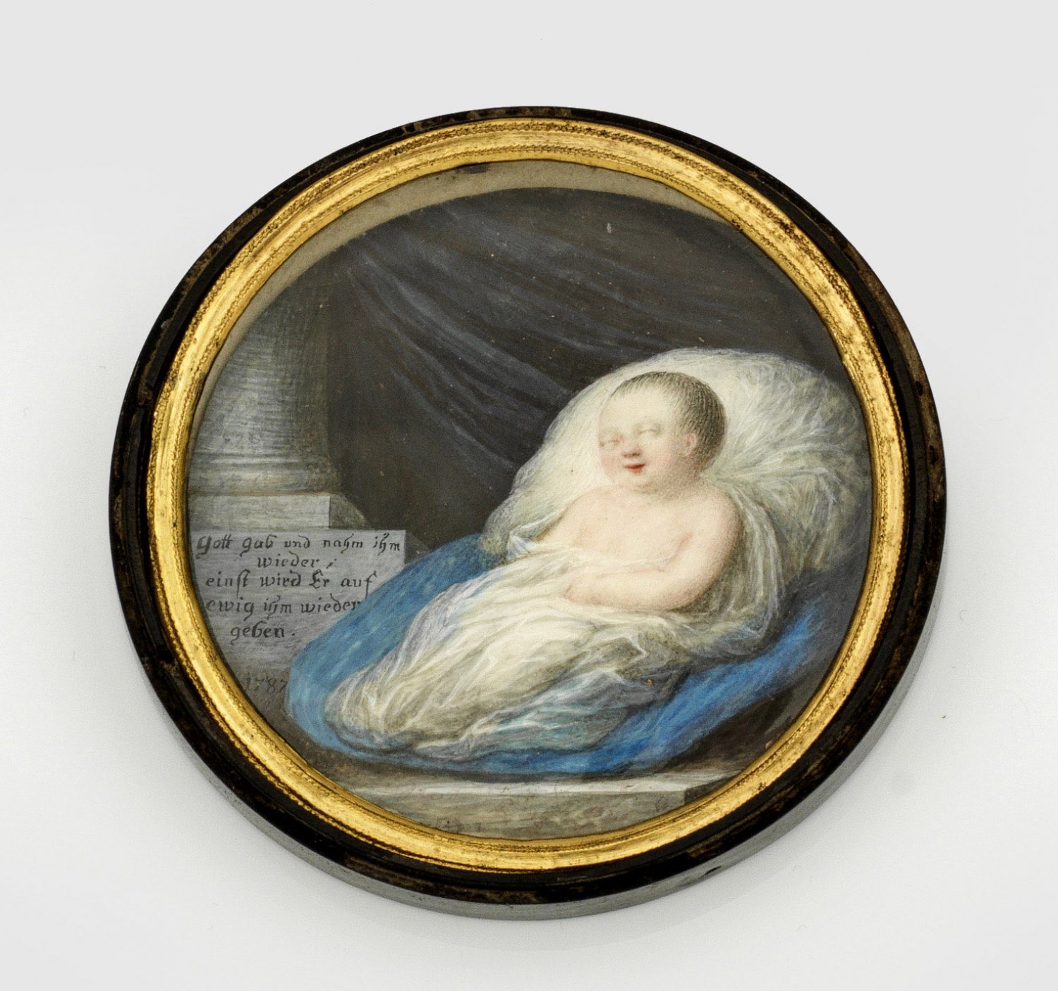 Porträt eines Kleinkinds Rundes Bildnis eines verstorbenen Säuglings, in weiße und hellblaue Tücher gehüllt. Gebettet auf einem kleinen, blauen Bett vor einer Steinsäule und dunkelblauem Vorhang. Mit Schriftzug "Gott gab und nahm ihm wieder; einst wird er auf ewig ihm wieder geben." Dat. 1787. Temperamalerei. Ebonisierter Holzrahmen mit Messingblende. D. 5,5 cm.