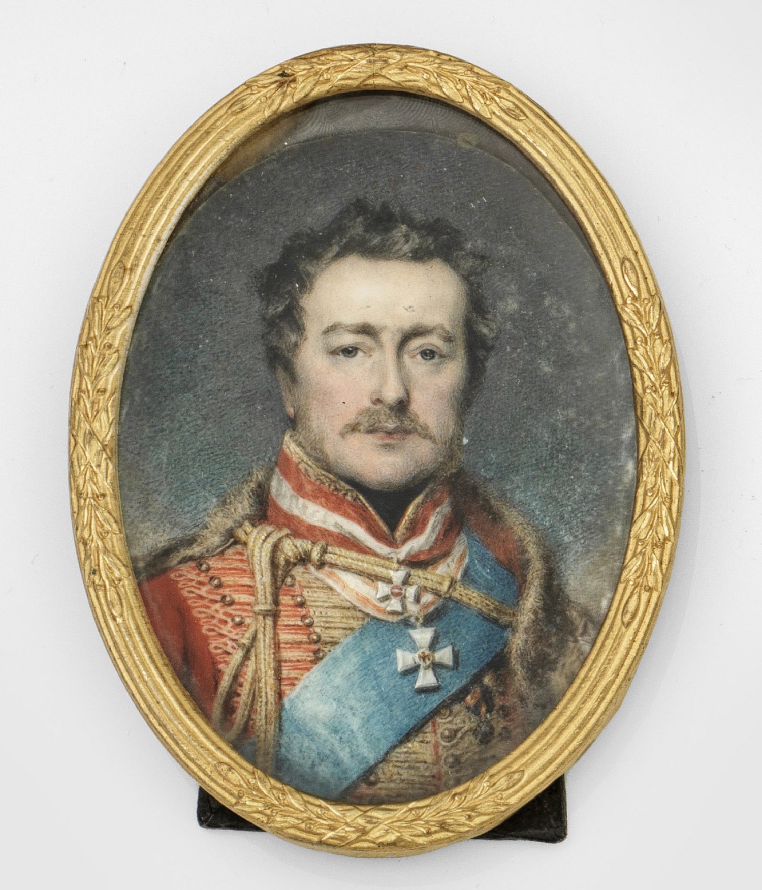 Friedrich VI. Landgraf von Hessen-Homburg Ovales, nahezu frontales Brustbildnis des Landgrafen Friedrich Joseph Ludwig Carl August von Hessen-Homburg (1769 - 1829) als Generalmajor des 4. österreichischen Husarenregiments in roter Galauniform mit blauer Schärpe, mit goldenen Borten und Schnüren besetzt. Über den Schultern mit pelzbesetzter Pelisse. Der Landgraf trägt über der Brust, neben dem Roten-Adler-Orden von Preußen, das ihm 1815 verliehene Kommandeurkreuz des Militär-Maria-Theresien-Ordens als höchste militärische Auszeichnung der Habsburgermonarchie. Dunkelgrauer Hintergrund. Feine Temperamalerei. Rückseitig undeutlich bez.; Ornamentierter, vergoldeter Messingrahmen, aufstellbar. 7,2 cm x 5,6 cm.