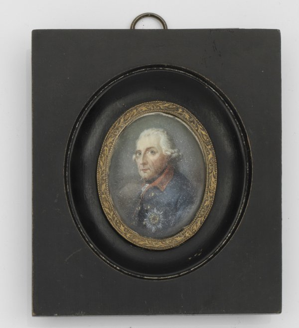Friedrich der Große Ovales Brustbildnis des preußischen Königs Friedrich II. in Uniform mit Bruststern des Schwarzen Adlerordens, nach dem Gemälde von Anton Graff von 1781. R. m. undeutlich sign.; Temperamalerei. Ebonisierter Holzrahmen mit ornamentierter Messingblende. 3,5 cm x 4,5 cm.
