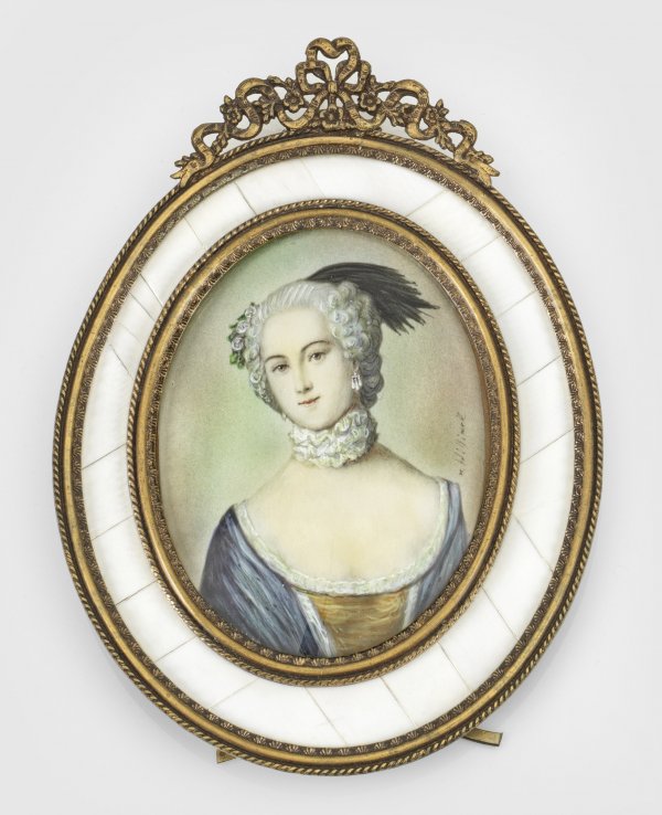 Ovales Brustbildnis der Markgräfin in blauem Kleid mit weißem Rüschenkragen um den Hals. Die hochgesteckten, grau gepuderten Haare mit dunklen Federn geschmückt. Hellgrüner Hintergrund. R. m. undeutlich sign.; Temperamalerei. Messingrahmen, bekrönt von durchbrochen gearbeiteter Schleife. Rückseitig aufstellbar. 8 cm x 6 cm.