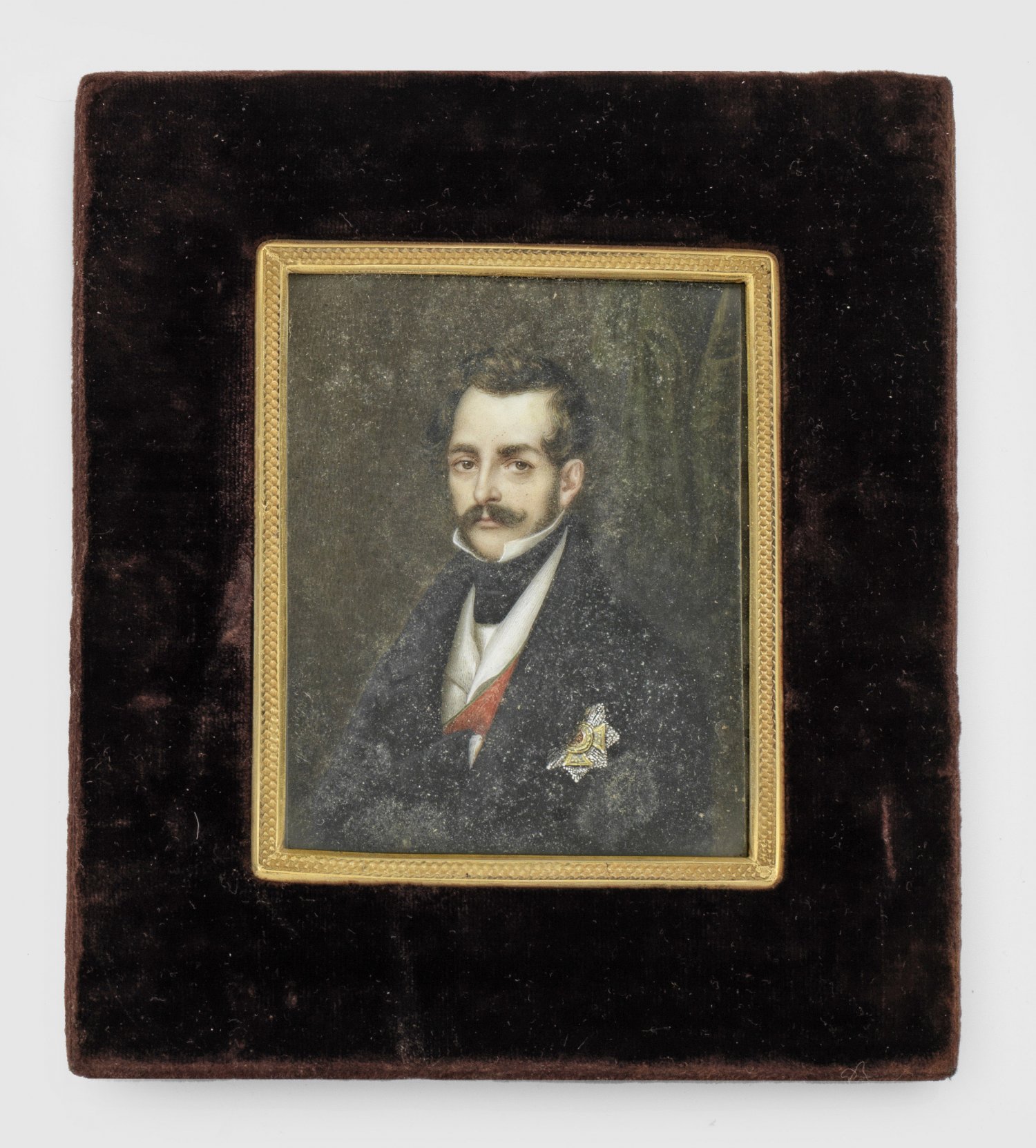 Fürst Heinrich XX. Reuß zu Greiz Brustbildnis des Fürsten Heinrich XX. (1794-1859) gekleidet in eine schwarze ordensgeschmückte Jacke über weißem Hemd mit hochgestelltem Kragen. Im Hintergrund ein dunkler olivgrüner Vorhang. L. u. undeutlich sign. Temperamalerei. Mit dunkelrotem Samt bezogener Rahmen rückseitig aufstellbar und Messingblende. 8 cm x 6 3 cm.