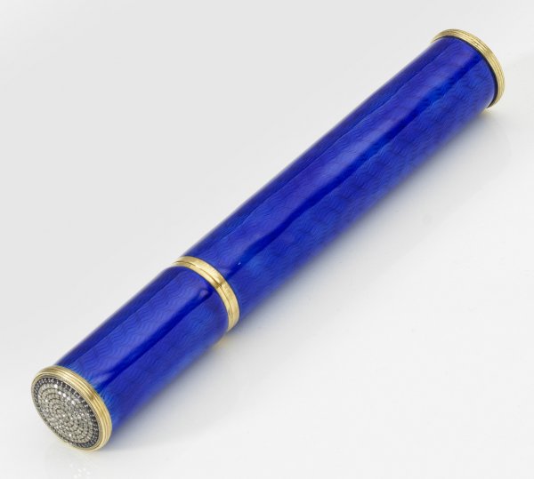 Zigarrenetui im Stil von Karl Fabergé. Silber vergoldet. Zylindrische Form. Umlaufend blau emailliert über feinem wellenförmig guillochiertem Grund. Deckeloberseite besetzt mit blauen und weißen Steinen. Gest. Kokoschnik 88. L. 18 5 cm.