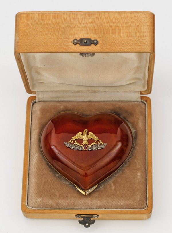 Herzdose im Stil von Karl Fabergé. Mit Holzschatulle. Silber vergoldet und emailliert. Herzförmiger leicht gewölbter Korpus flächendeckend rotbraun emailliert. Drücker linear besetzt mit 5 Diamantrosen. Auf dem Deckel aufgelegter bekränzter Schwan besetzt mit einem Granatcabochon und kleinen Diamantrosen. Innen vergoldet. Gest. 88. Gew. ca. 150 g. 8 5 cm x 8 cm.