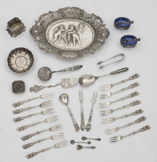 Konvolut Historismus-Silber Silber, teilw. plated. 32-tlg.; U. a. 14 Kuchengabeln mit Blumendekor, zwei Salieren mit Einsatz aus blauem Glas, eine Pillendose mit Farbsteinen besetzt sowie eine kleine Schauplatte mit reliefplastischem Dekor und durchbrochen gearbeiteter Fahne. Altersgemäßer Gebrauchszustand. Gest. 800, 835. Gew. zus. ca. 1020 g.