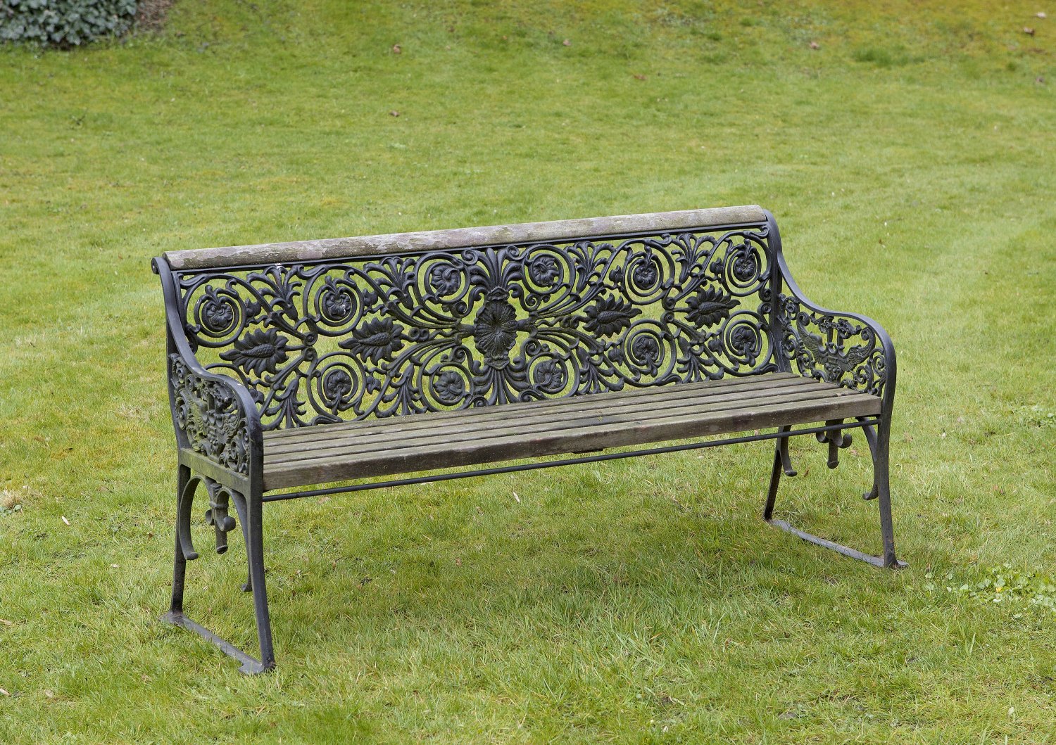 Gusseisen mattschwarz lackiert sowie rotbraun gebeiztes Holz. Durchbrochen gearbeitete schmale Seitenwangen aus stilisierten Adlermotiven und Blattwerk in leicht zurückschwingende Rückenlehne aus zentraler Blütenrosette und üppigen eingerollten Blattvoluten übergehend. Sitzfläche und Lehnenabschluss aus gekanteten Stegen. H. 84 cm. 163 cm x 53 cm. Sitz-H. 43 cm.