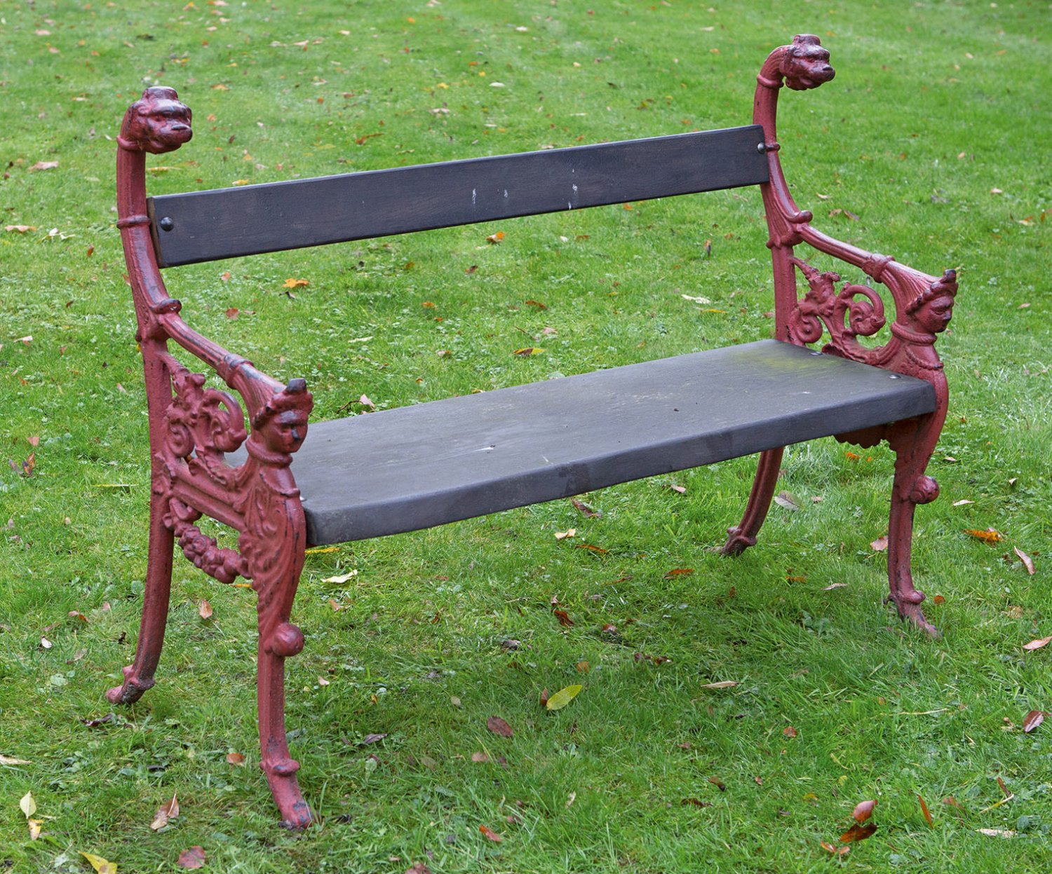 Russische Empire-Parkbank Gusseisen rot lackiert und Holz. Schmale durchbrochen gearbeitete Seitenwangen aus eingerollten Blattvoluten und Festons mit leicht ausgestellten Beinen sowie hohen gebogten Bekrönungen in Form von vollplastisch gestalteten Chimärenköpfen. Gerade Sitzfläche und entsprechende Lehne. H. 95 cm. 124 cm x 40 cm. Sitz-H. 44 cm.