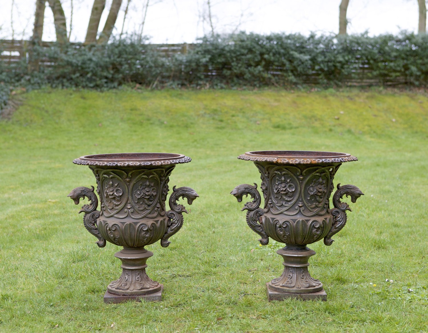 Paar Belle Epoque-Gartenvasen Eisenguss. Balusterförmiger Korpus mit breitem Fries aus gegeneinander gestellten Voluten und Zungenmotiven auf quadratischer Plinthe. Umlaufend der Wandung erhaben reliefierte, ineinander verschlungene C-Bögen sowie blütengefüllte Füllhörner. Weit ausschwingender Lippenrand sowie Volutenhenkel mit Chimärenköpfen. Minim. besch.; H. 61 cm.