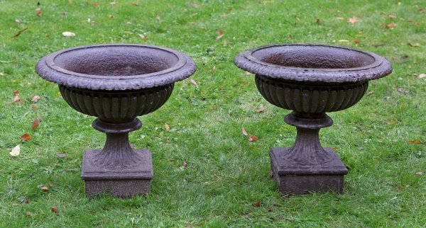 A pair of cast iron garden vases.