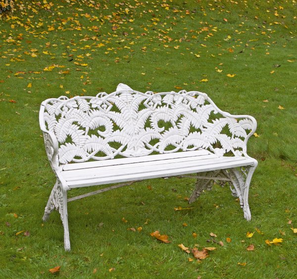 Parkbank Metall und Holz teilw. weiß lackiert. Geschwungener durchbrochen gearbeiteter Korpus aus üppigen Farnblättern mit schlanken vegetabil gestalteten Beinen. Sitzfläche aus schmalen gekanteten Stegen. H. 87 cm. 146 cm x 52 cm. Sitz-H. 43 cm.