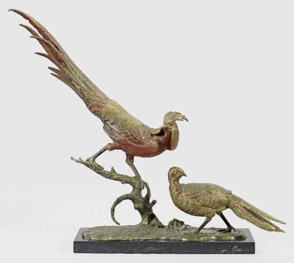 Bronze, braun bzw. dunkel patiniert. Sign. u. monogr.; Gießerstempel "BILDGIESSEREI KRAAS (/) BERLIN S 42". Anthrazitfabener Marmorsockel. Große, typische Gruppe Büschelbergers, der für seine realistischen Tierskulpturen intensive Studien im Dresdener Zoo betrieb. Sockel minim. best.; Ges.-H. 80 cm.