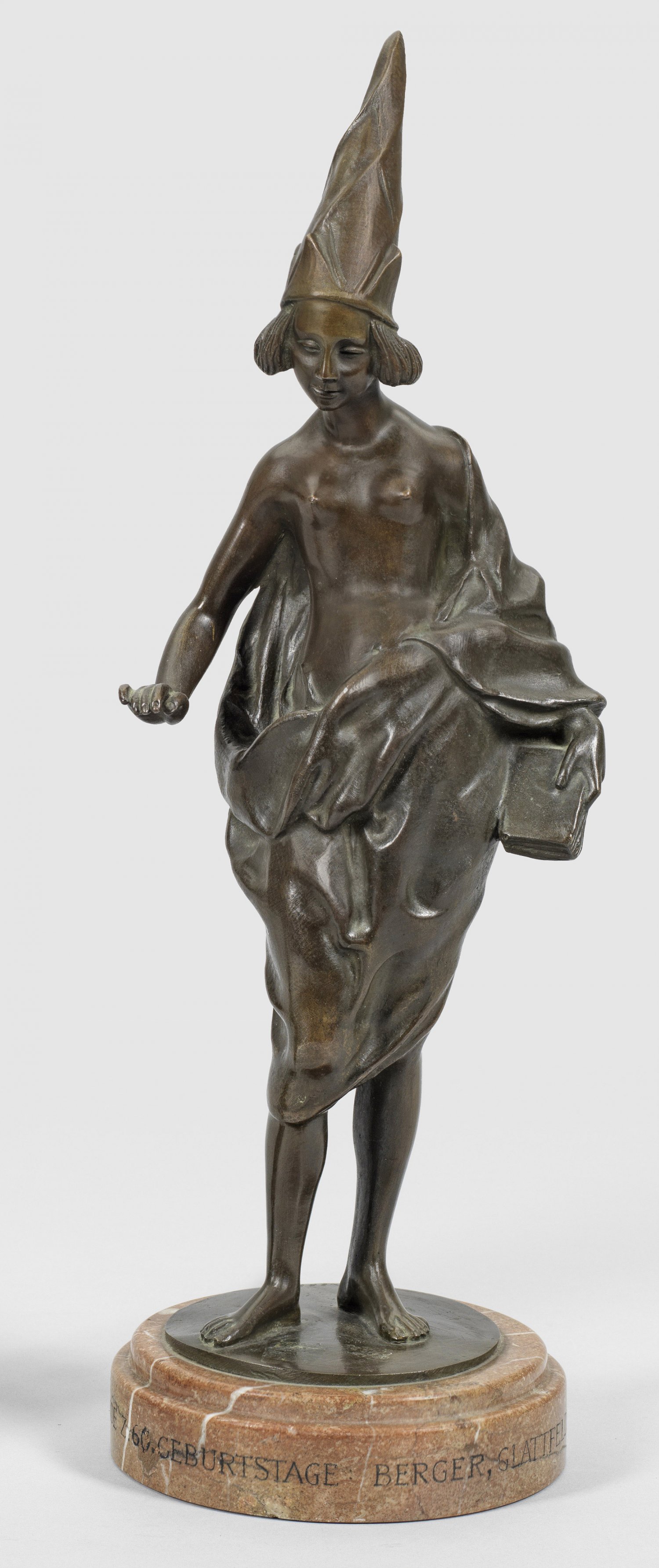 Bronze, dunkelbraun patiniert. Sign.; Rötlicher Marmorsockel mit Widmungsinschrift. Auf einer runden Plinthe stehender Halbakt mit spitzem Hut in bedächtiger Pose, gewandet in einen weiten Umhang, in der linken Hand ein Buch haltend. Subtil modellierte Art Déco-Statuette des Bildhauers, der Schüler von Anton Pruska, Heinrich Maria Waderé und Philipp Widmer war. Neppel wirkte seit 1919 als Lehrer an der Gewerbeschule in München und stellte u. a. im Glaspalast aus. Ges.-H. 45 cm.