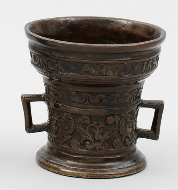 Datierter Renaissance-Mörser Bronze, dunkel patiniert. Konischer Korpus mit stark geweitetem Rand und gekanteten Griffen über ausgestelltem Stand. Wandung gegliedert von umlaufenden Reliefbändern mit stilisiertem Rankenwerk. Oberhalb Inschrift mit Dat. "LEEFTE VERWINT AL DINCK ANNO 1590". H. 9,5 cm. D. 10 cm.