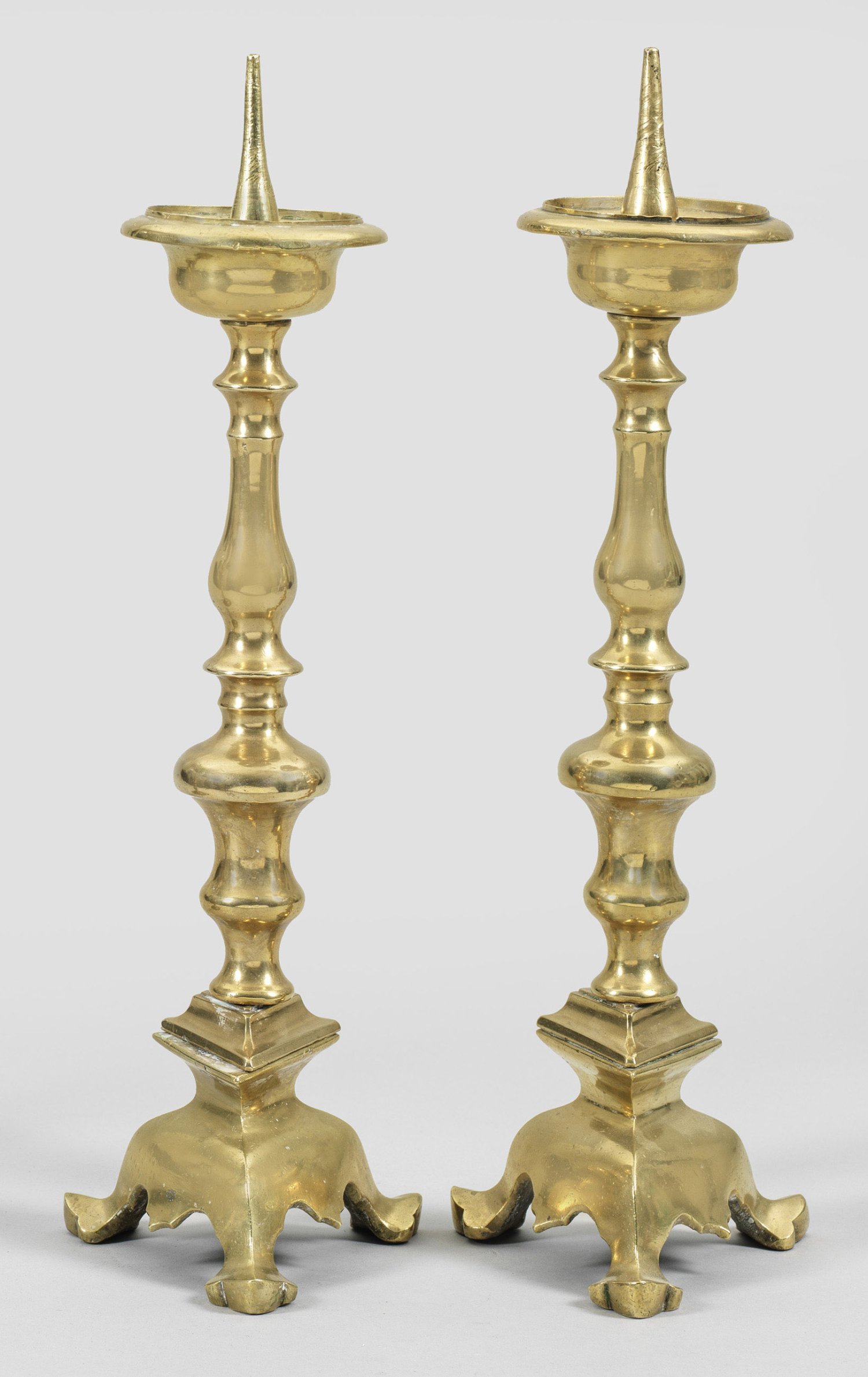 Paar Barock-Leuchter Bronze. Geschwungener Dreiecksockel mit stilisierten Tatzenfüßen übergehend in hohen geschraubten Balusterschaft. Runde tief gemuldete Traufschale und sich konisch verjüngender Dorn. Minim. altersbedingte Gebrauchsspuren. H. 44 cm.