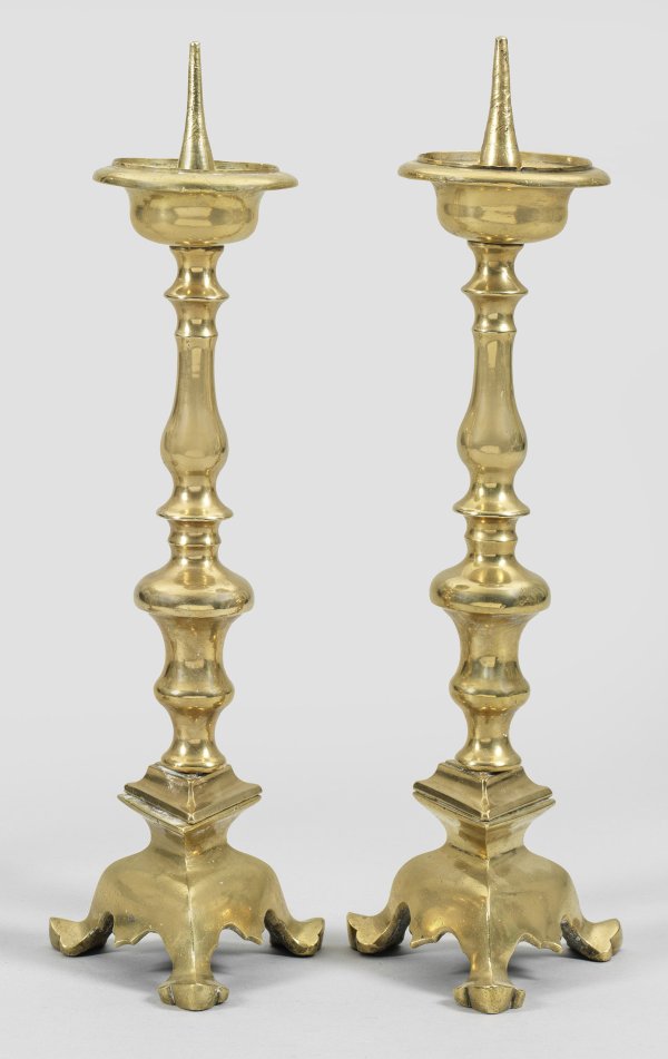 A pair of probably Nuremberg Baroque brass candlesticks. Minor age-related signs of use.