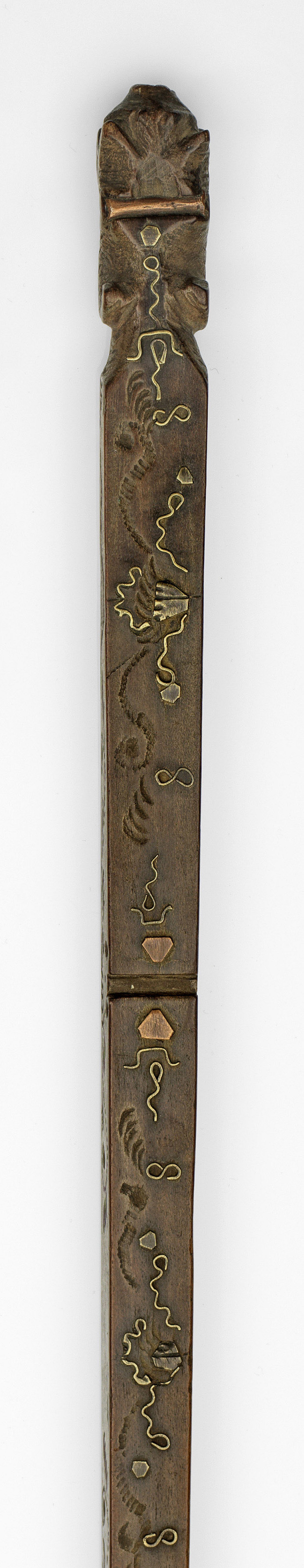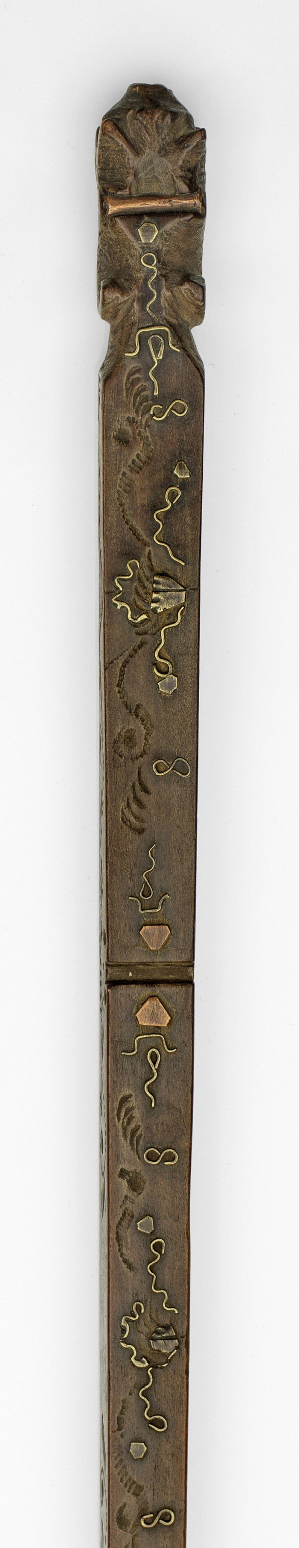 Schneider-Elle Holz. Vierkantig konisch zulaufend. Obenauf eine geschwungene abstrakte Schnitzarbeit. Schau- und rückseitiger Dekor aus eingelegten Messing- und Kupferdrähten. Umlaufend im Strich- und Punktedekor geschnitzte Voluten. Rückseitig dat. 1799. L. 68 5 cm.