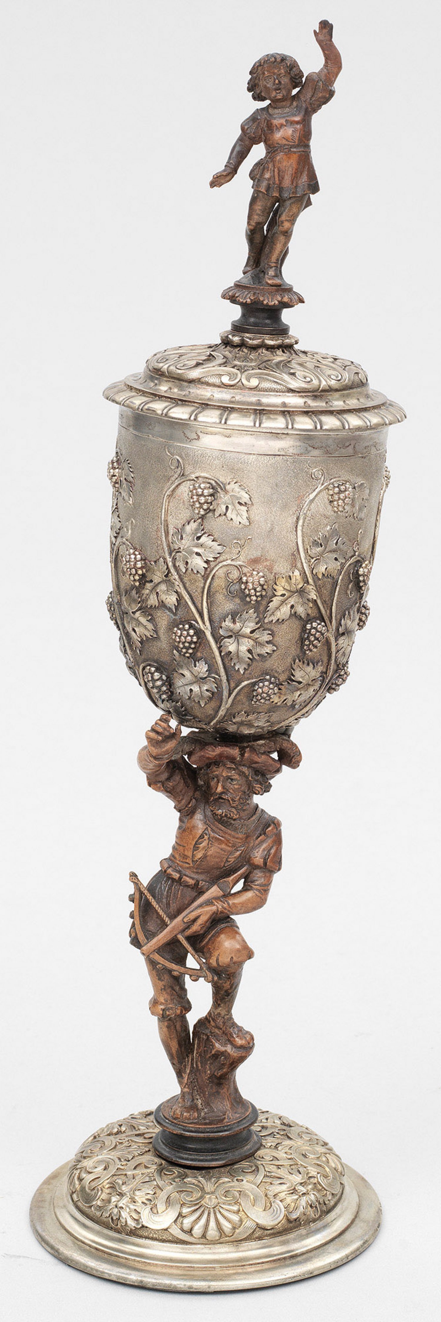 Historismus-Deckelpokal Metall vergoldet und Holz geschnitzt. Gewölbter von reliefierten Muscheln Bandelwerk und Grotesken gerahmter Stand. Vollplastisch in Gestalt des Schweizer Freiheitskämpfers Wilhelm Tell geschnitzter Schaft. Hohe zylindrische Kuppa umzogen von naturalistischen Weinranken. Dem Stand entsprechend reliefierter Deckel mit bekrönender Putto-Holzskulptur. H. 41 cm.