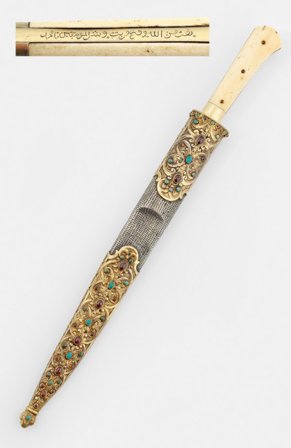 A splendour dagger with Arabic inscription and a gilt silver sheath, set with rubins and turquoises.