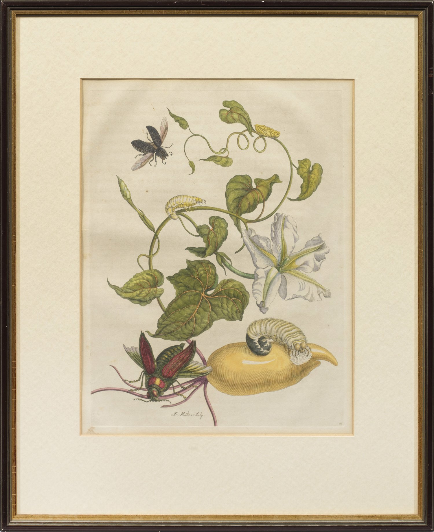 Altkolorierter Kupferstich/Papier. In der Platte sign.; Nach Maria Sibylla Merian (1647 - 1717), Blatt 50 aus deren "Metamorphosis Insectorum Surinamensium" (Die Verwandlung der surinamesischen Insekten), erstmals erschienen in Amsterdam bei Gerard Valk, 1705. Plattenmaß ca. 35 cm x 25,5 cm. Rahmen.