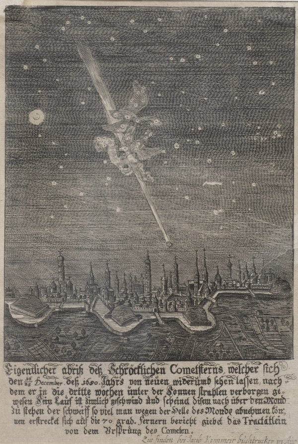 Vgl. Drugulin 3020. Das seltene Blatt zeigt den zum Jahreswechsel mit bloßem Auge sichtbaren "Großen Kometen" von 1680 (C/1680 V1), der für die Astronomie und Physik bedeutend war.