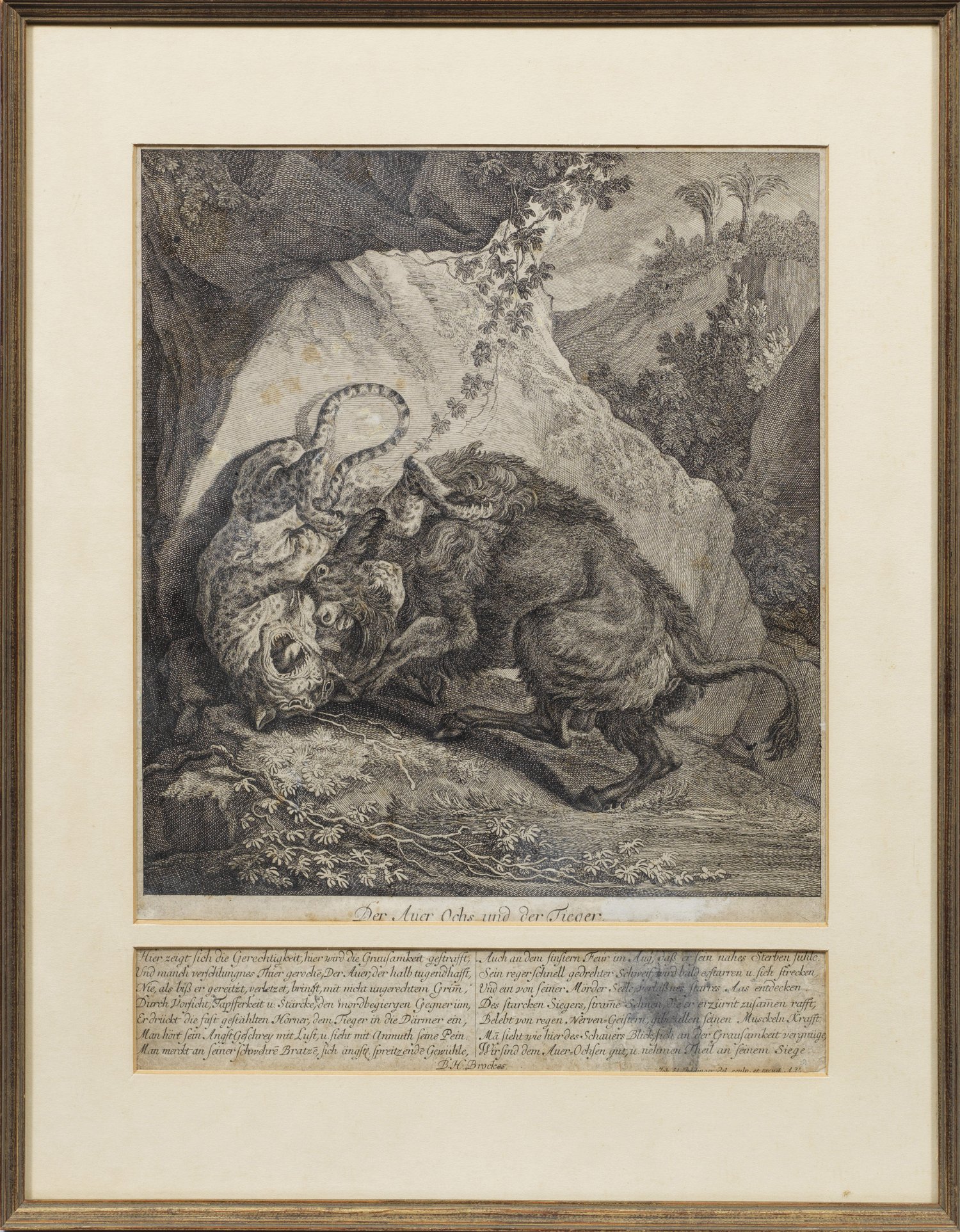 Kupferstich/Papier, 1760. Blatt 2 aus "Kämpfe reißender Tiere". In der Platte sign. u. betitelt. Darstellung eines Auerochsen im Kampf mit einem Tiger, unterhalb der Darstellung ein Gedicht von B. H. Brockes. Wvz. Thienemann 717. Darstellung ca. 30 cm x 28 cm. Gebräunt, fleckig. Rahmen.