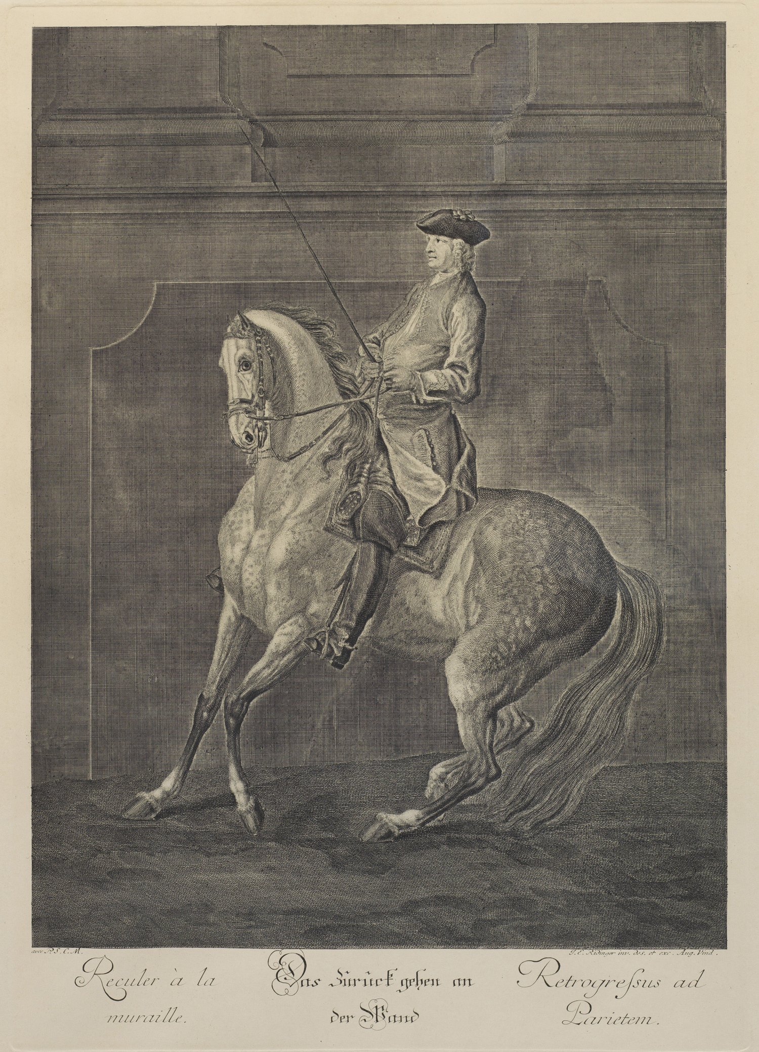 Kupferstich/Papier, 1734. Blatt 9 aus "Neue Reit Schul vorstellend einen vollkommenen Reuter in allen Lectionen", verlegt von J. E. Ridinger, Augsburg, 1734. In der Platte sign. u. dreisprachig betitelt. Wvz. Thienemann/Schwarz 636. Wohl späterer Abzug. Plattenmaß ca. 5,5 cm x 39,5 cm. Rahmen.