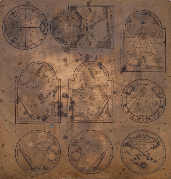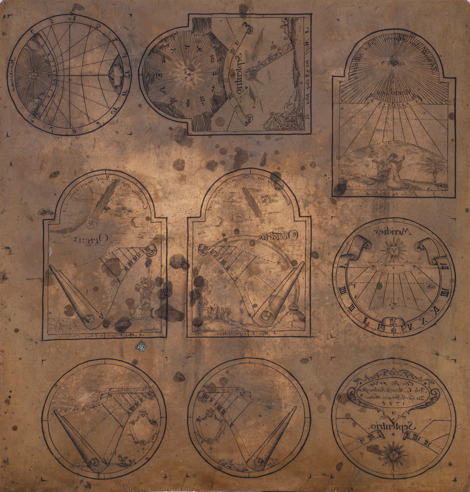 Kupferstichplatte für Sonnenuhrskalen Kupfer. Rechteckige Kupferplatte mit neun unterschiedlichen, fein gravierten und detailreichen, runden sowie portalähnlich gestalteten Sonnenuhrenskalen. Teilw. mit hebräischer oder lateinischer Inschrift, Monatsangaben sowie den Sternkreiszeichen. Eine Skala bez. und dat. "Joh: G. Mair Schulmeister in Grosselfingen Anno 1744". 20 cm x 21,3 cm.