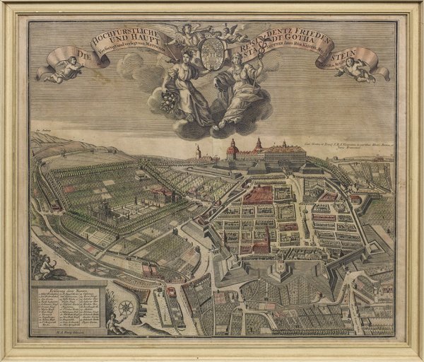 Kupferstich von Matthäus Seutter nach H. A. König (Koenig), Augsburg, um 1738-1745. Ansicht von Gotha, des Schlosses und der Schlossgärten aus der Vogelschau mit großer Titelbordüre, Stadtwappen, Engeln und weiblichen Allegorien im Himmel. Blatt ca. 51 cm x 60,5 cm. Rahmen.