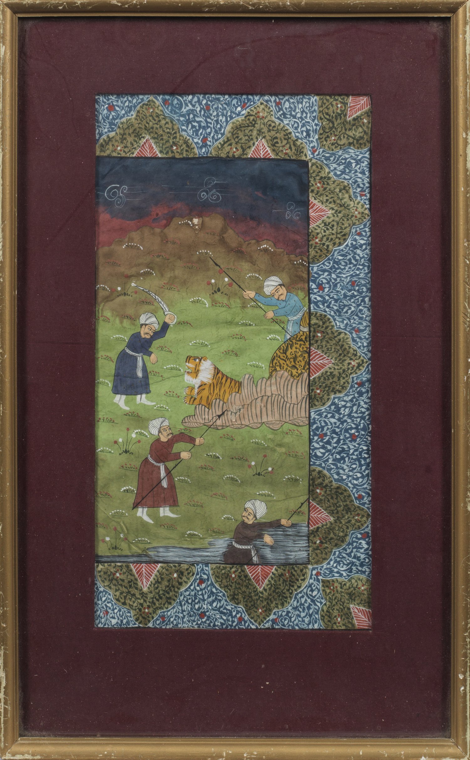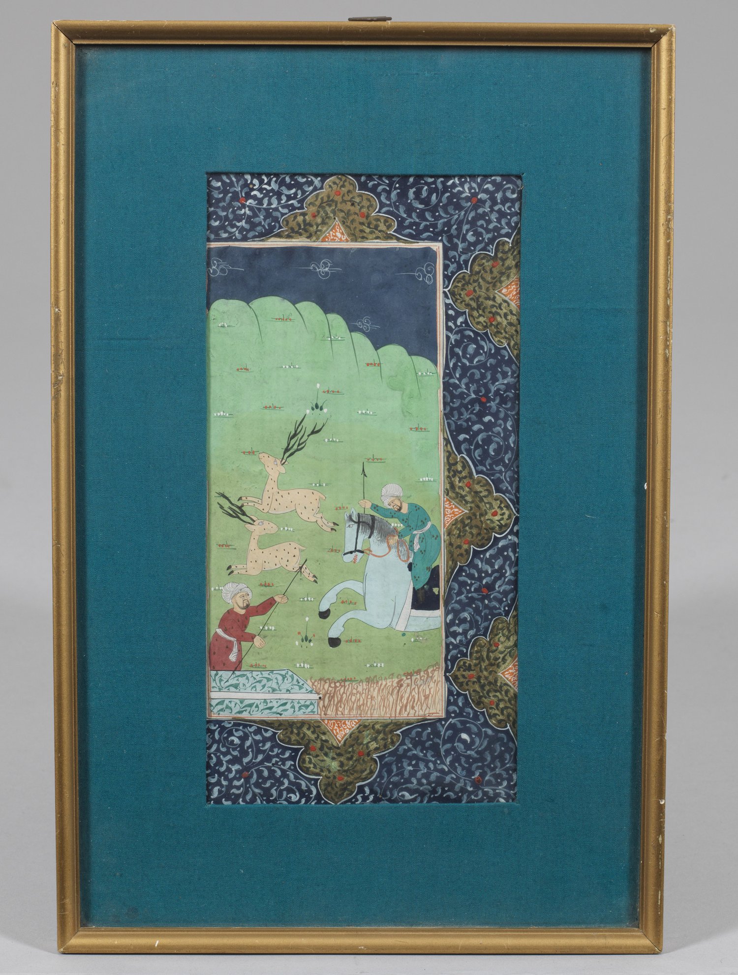 Fünf indische Mogul-Miniaturmalereien Gouache auf Papier. Fünf szenische Darstellungen der Jagd bzw. von Jagdgesellschaften in stilisierten Landschaften in äußerst feiner polychromer Miniaturmalerei teilw. rückseitig schwarze bzw. rote Kalligraphien. Begrenzt von korrespondierender Bordüre aus feiner Brokatmalerei. Rahmen mit farbigem Passepartout. H. 17 5/22/25 x 10 5/10/13.