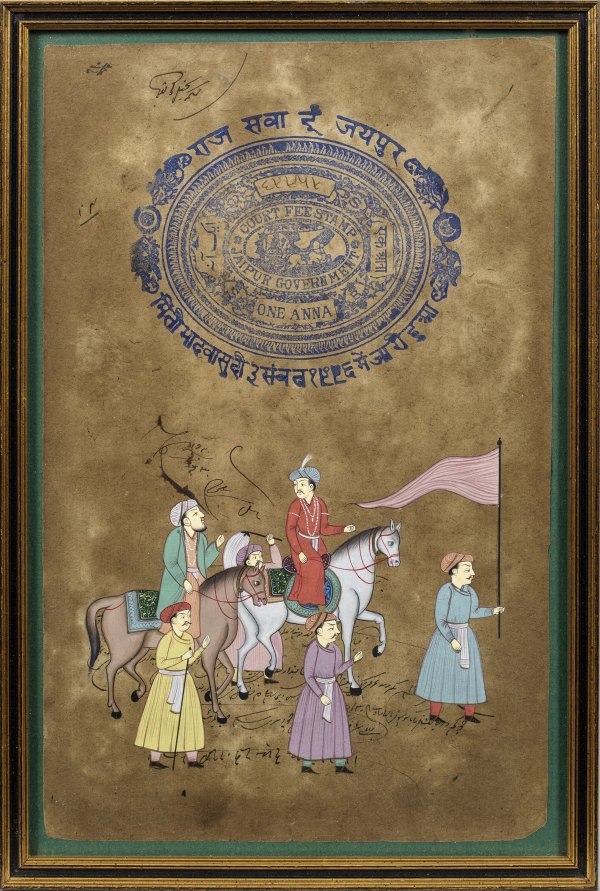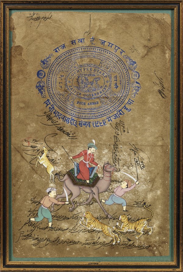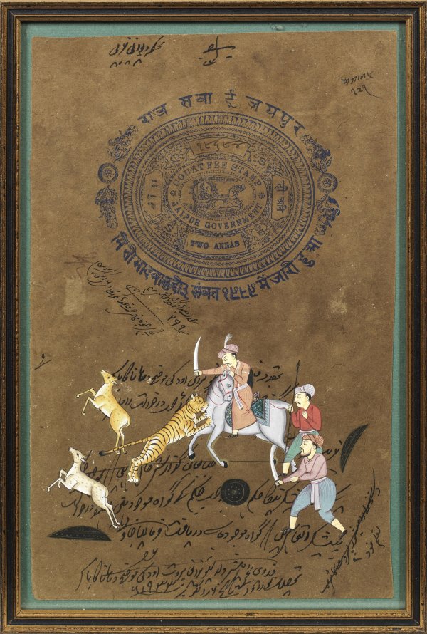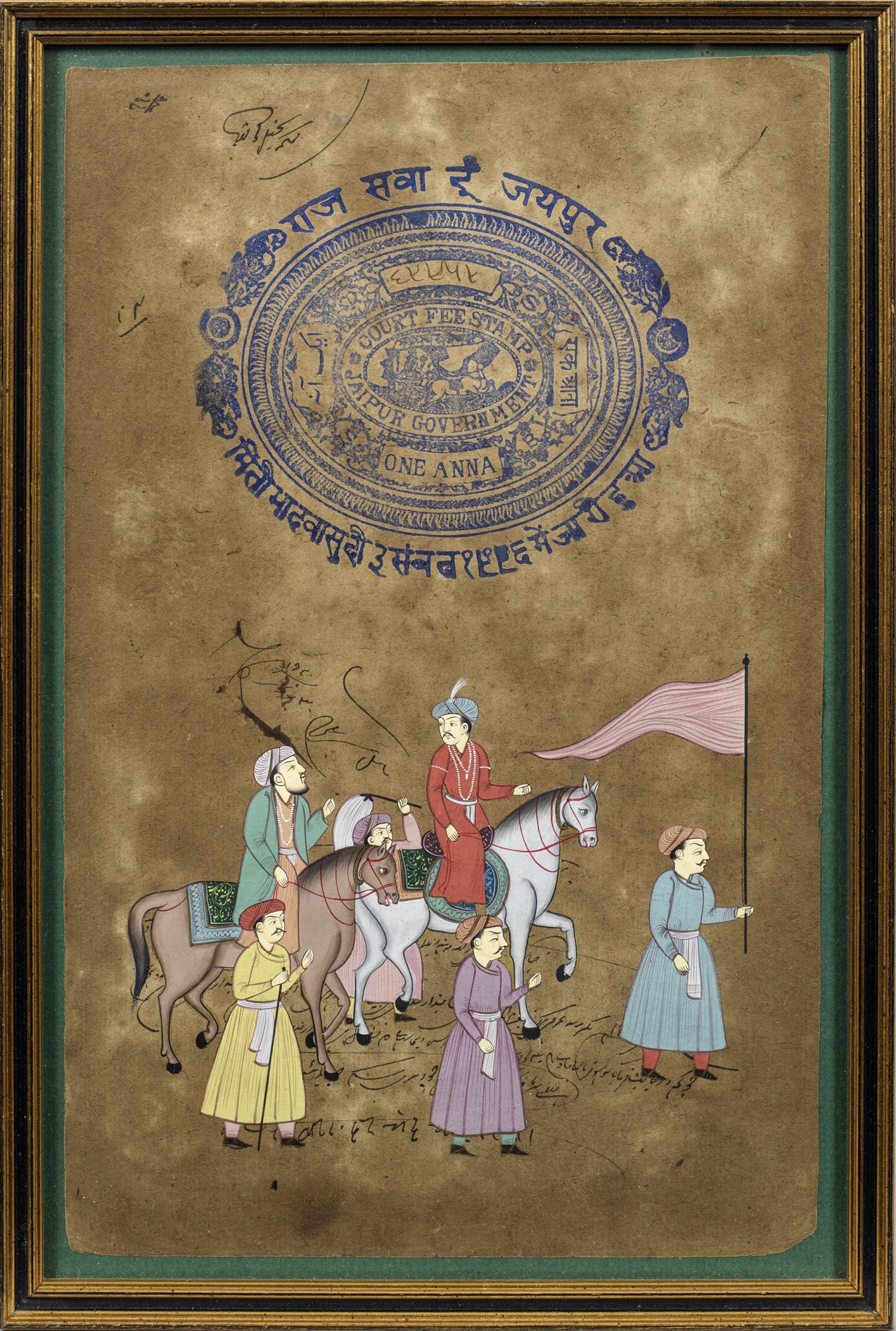 Vier indische Miniaturmalereien Gouache auf Papier teilw. goldgehöht. Vier szenische Darstellungen der Jagd in stilisierten Landschaften in äußerst feiner polychromer Malerei. Oberhalb Court Fee Stamp Jaipur Government. H. 33 5 x 22