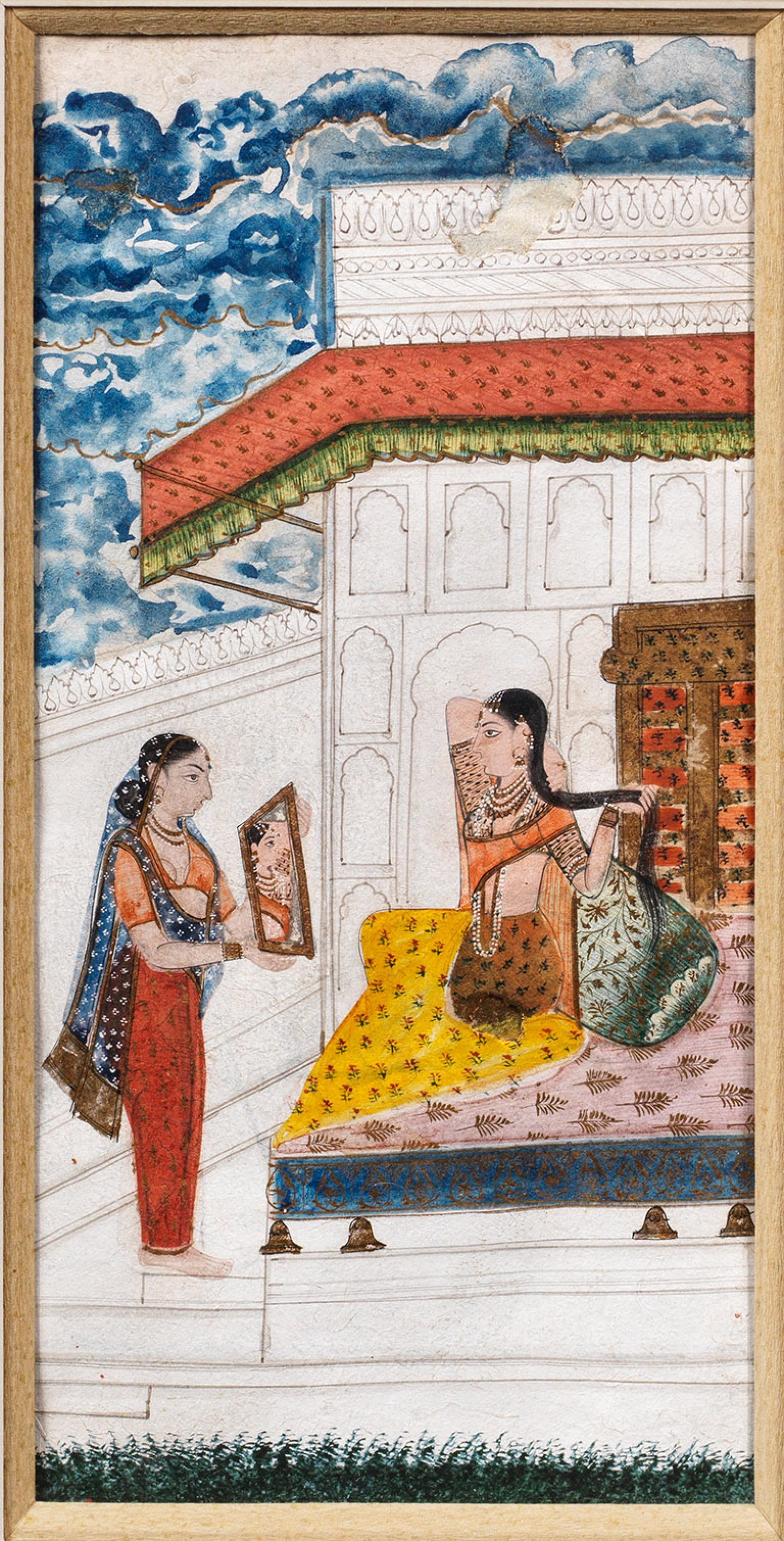 Indische Miniaturmalerei Gouachemalerei mit Gold auf Pergament. Hochrechteckiges Bildfeld mit höfischer Palastszene. Vor Architekturkulisse sitzende, junge Prinzesson bei der Toilette mit ihrer Hofdame. Altersbedingte, retuschierte Besch.; Moderner Rahmen mit Passepartout. 34,5 cm x 24,5 cm.
