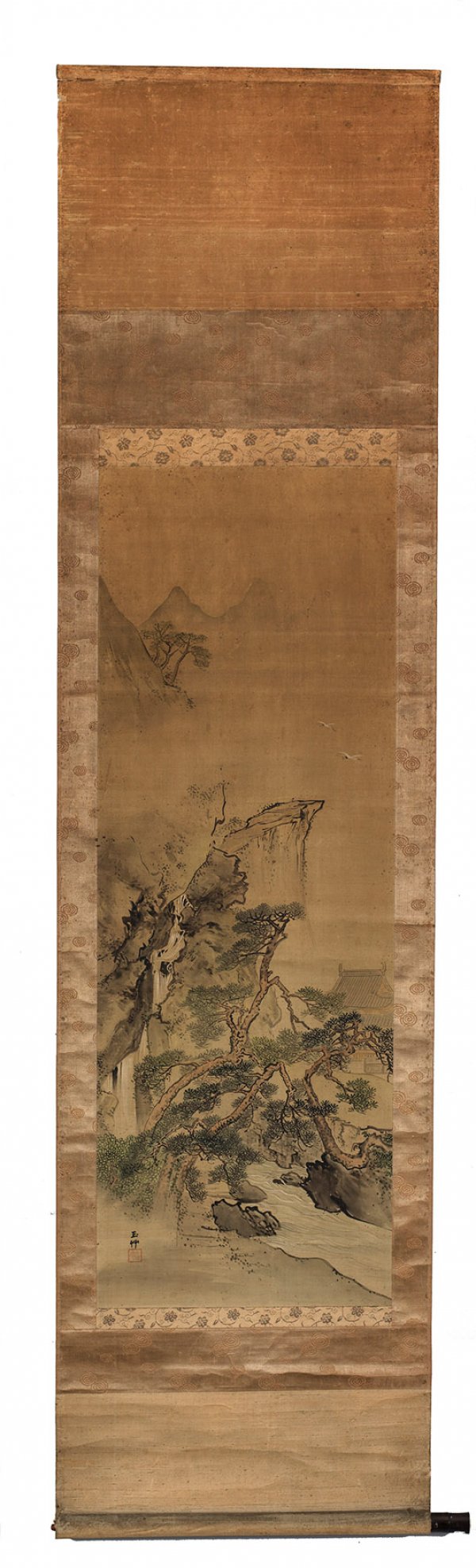Zwei chinesische Rollbilder Flusslauf mit baumbestandenem Gebirge und Architektur als farbige Tuschmalerei auf Papier. Oberhalb rote Siegel-Sign. und schwarze Kalligraphien. L. 231/195 cm x 54/50 cm.