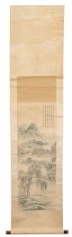 A Chinese rouleau watercolor drawing with river landscape with trees and architecture. Red seal mark and black calligraphies.