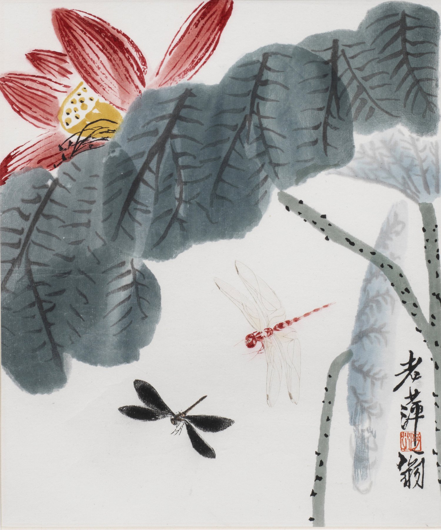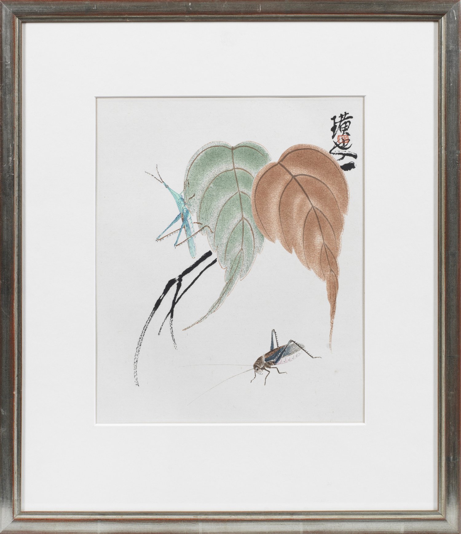 Drei chinesische Tuschmalereien Stilisierte Gartenlandschaften mit blühendem Mohn, Lilien und Ahornblättern sowie szenischen Darstellungen von Heuschrecken und Libellen als farbige Tuschmalerei auf Papier. Oberhalb sowie unterhalb rote Siegel-Sign. und schwarze Kalligraphien. L. 28,5 cm x 23,5 cm.