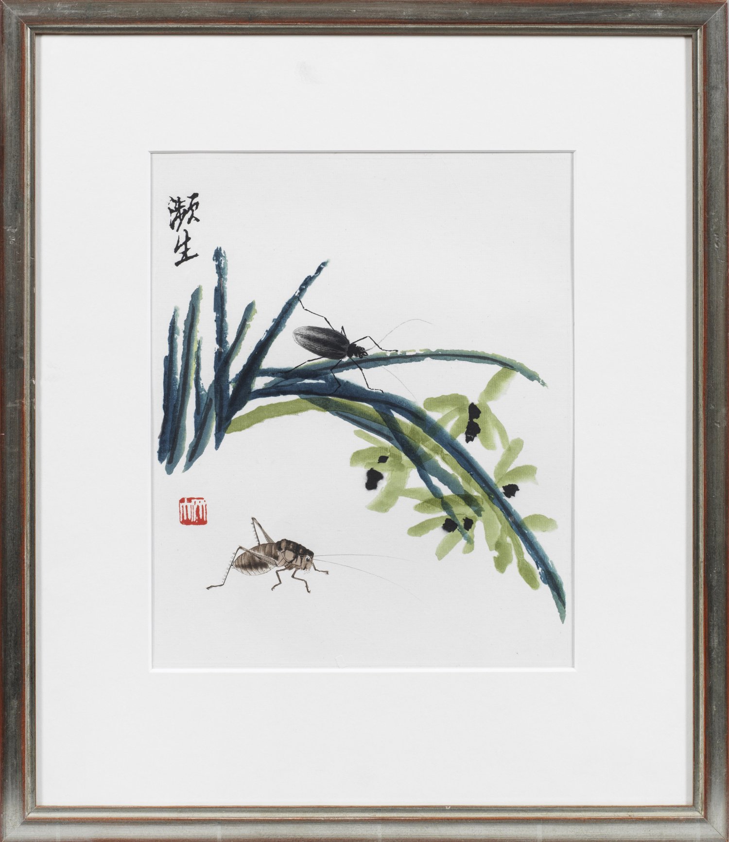 Three Chinese watercolor drawings; garden landscape with flowers, grashoppers and dragonflies. Red seal mark and black calligraphies.