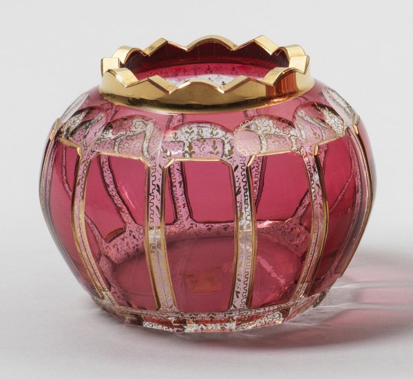 Farbloses Kristallglas, geschliffen. Gedrückt-kugelige Form, kurzer, hochgezogener Kronenrand. Der Korpus mit hoch geschliffenen, rosafarben lasierten Feldern. Flächendeckender Dekor in Goldmalerei, der Rand opulent vergoldet. H. 11 cm.