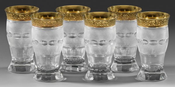 Farbloses Kristallglas, geschliffen. Geschweifte Becherform mit facettiertem Fuß, die Wandung mit flächendeckendem Schliffdekor, Lippenrand mit vergoldetem, geätztem, sog. oroplastischem Friesband aus Palmetten und Akanthusranken. Firmen-Ätzstempel. H. 13,5 cm.