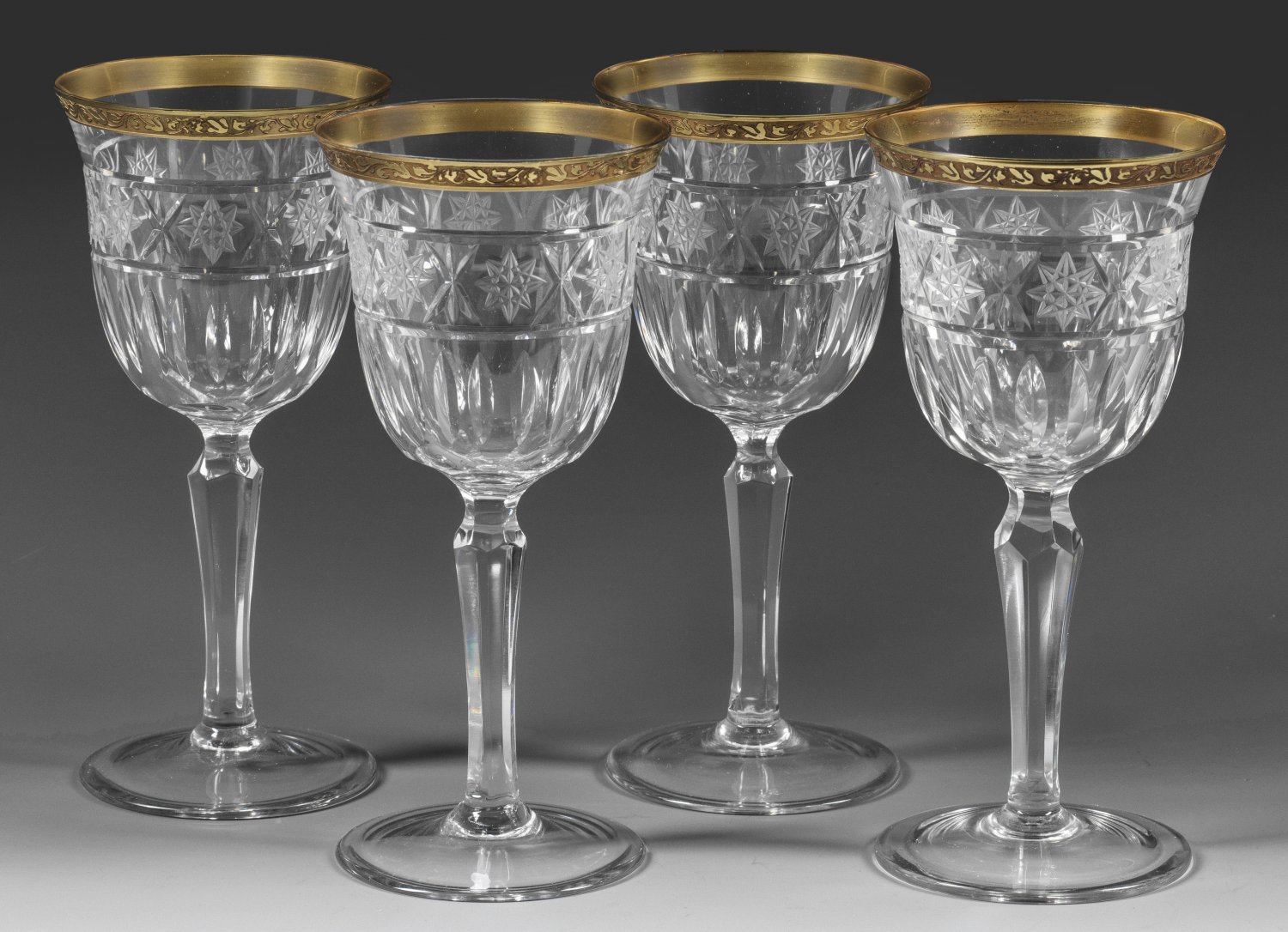 Four Czechoslovakian Moser cut crystal wine glasses with acid-etched and gilt rims.