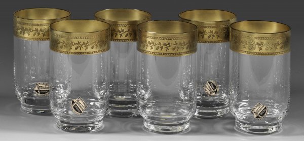 A set of six Czechoslovakian Bohemia Crystal cut water glasses with acid-etched and gilt rim. Label.