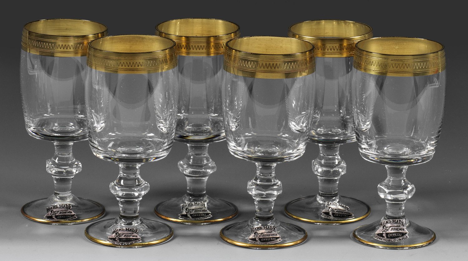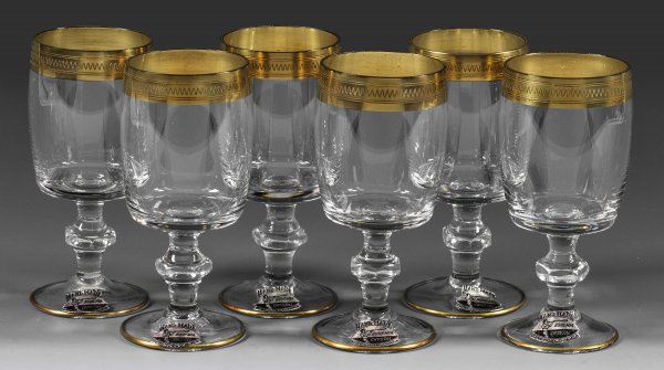 A set of six Czechoslovakian Bohemian Crystal cut sherry glasses with acid-etched and gilt rim. Label.