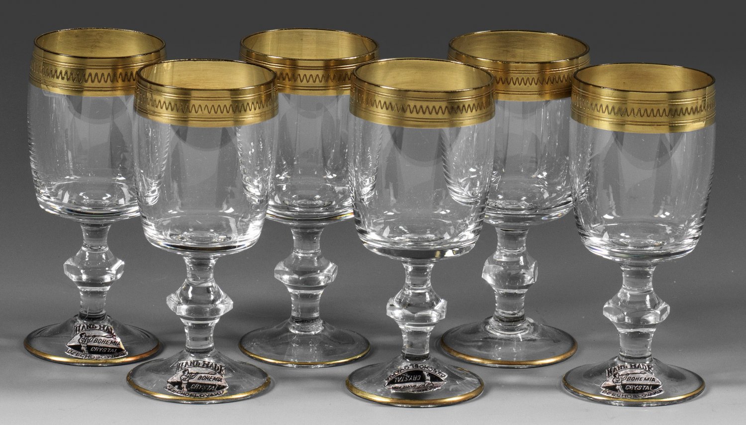 A set of six Czechoslovakian Bohemia Crystal cut shot glasses with acid-etched and gilt rim. Four glasses with label.