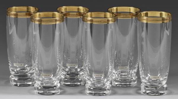 A set of six German cut crystal water glasses with acid-etched and gilt rim. Factory label.