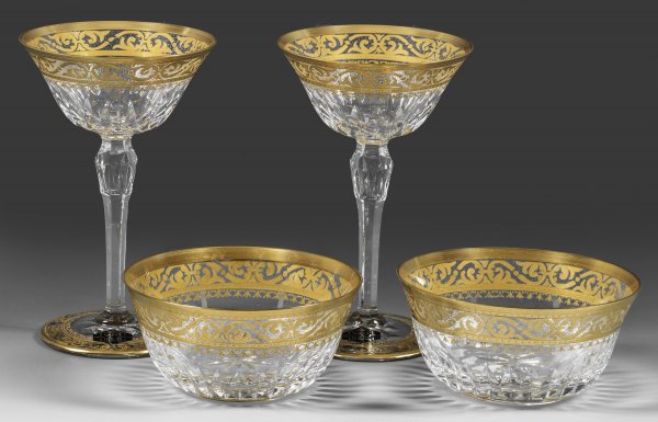 A collection of two French Saint-Louis "Stella Gold" cut crystal champagne glasses and two bowls. Acid factory mark, the champagne glasses additionally with factory labels.