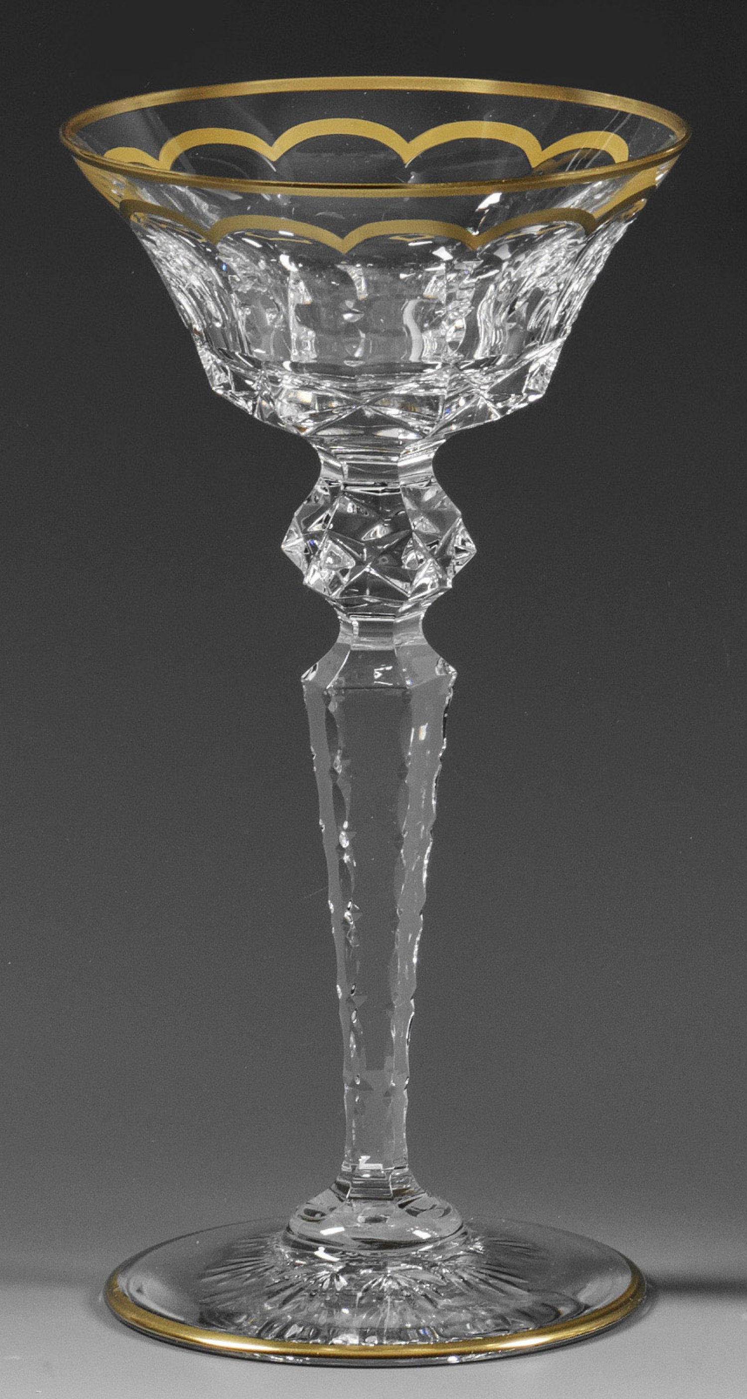 Farbloses Kristallglas, geschliffen und goldgerändert. Flacher Scheibenfuß mit Bodenstern, sechseckiger, schlanker Balusterschaft mit gesteineltem Kugelnodus, glockenförmige Kuppa mit reichem Zierschliff. H. 18,8 cm.