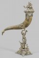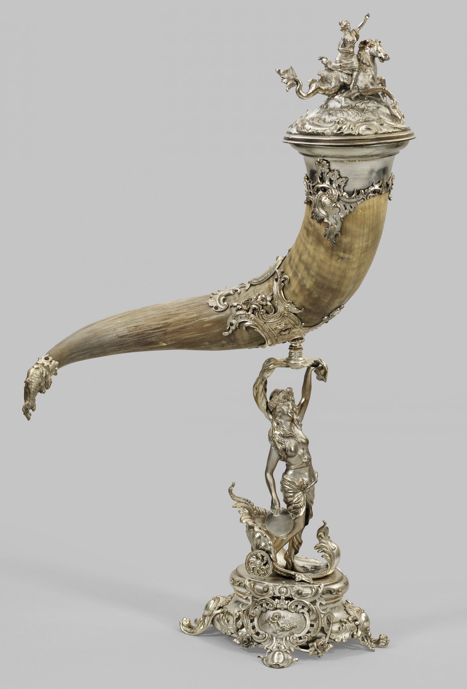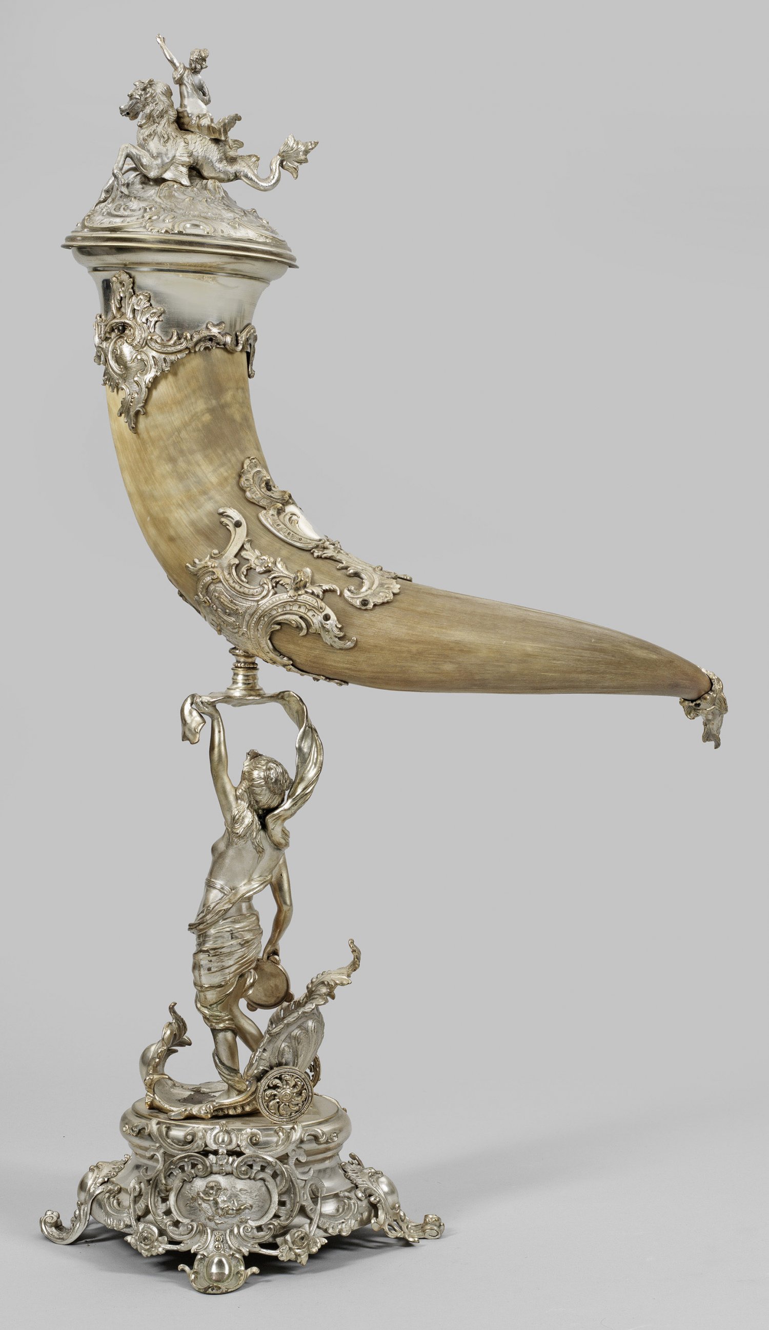 mit versilberter und vergoldeter Metallmontierung. Mehrfach profilierter Sockel, getragen und verziert von vier am applizierten Ansatz üppig durchbrochen gearbeiteten Volutenfüßen. Darüber eine vollplastische, halbnackte Frauenfigur. Der Körper von einem Tuch umschlungen, in einem stilisierten Streitwagen stehend. In der einen Hand ein Tamburin, mit der anderen ein hoch aufschwingendes, naturgewachsenes, beige- und graufarbenes, aufsteckbares Rinderhorn, verziert mit aufwändig gestalteten, reliefplastischen Rocaillen- und Blütenapplikationen haltend. An der Spitze des Hornes die vollplastische Darstellung eines Fisches. Der obere Abschluss mit ausschwingendem, trompetenförmigem Aufsatz. Runder, aufgewölbter und flächendeckend reliefplastisch mit Rocaillen und Voluten verzierter Deckel, bekrönt von vollplastisch figürlicher Darstellung einer Nereide auf einem Hippokampen reitend. Minim. Gebrauchsspuren. H. 93,5 cm.
