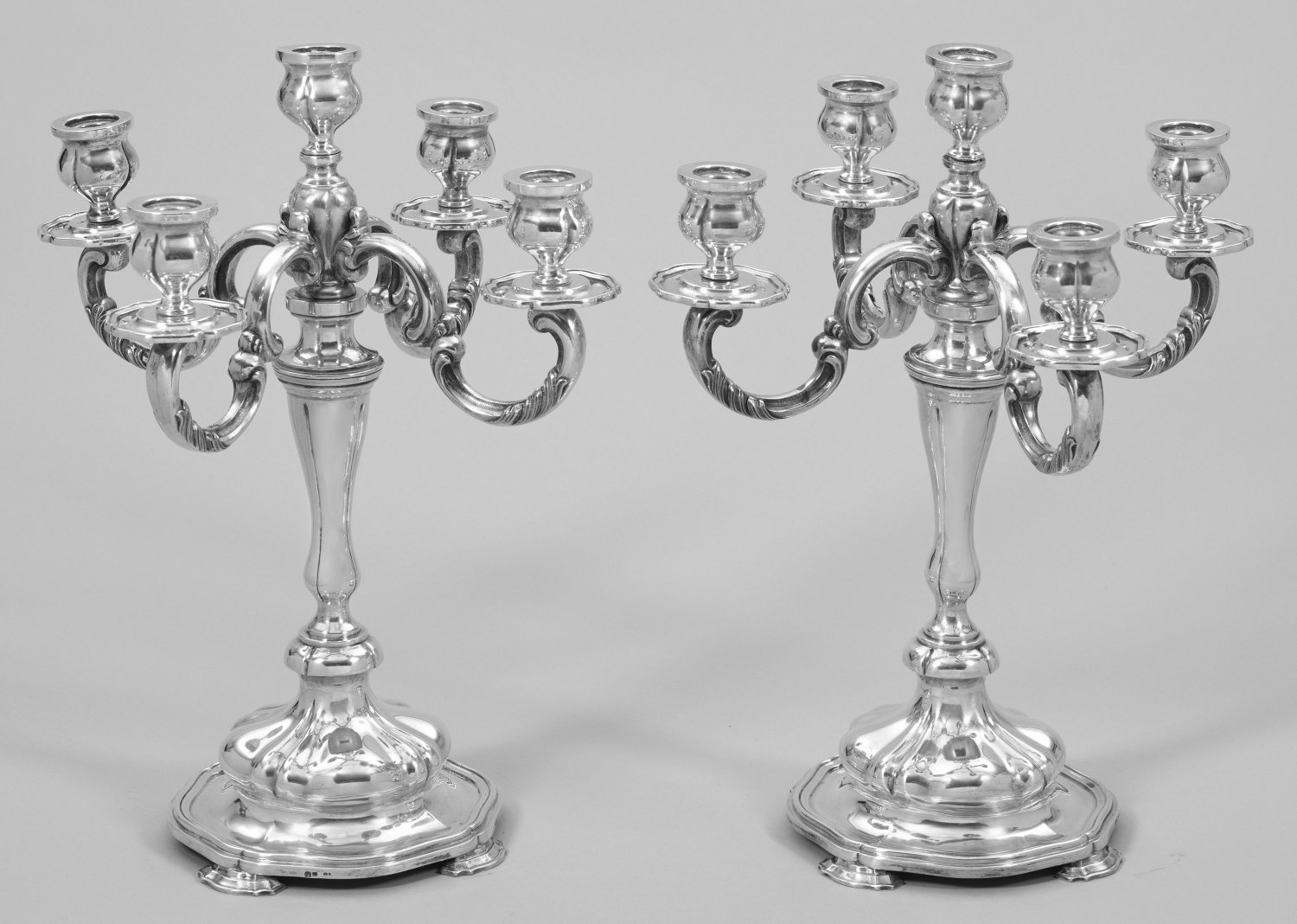 Silber. 5-flg.; Runder, profilierter Stand über vier ausgestellten flachen Füßen. Hoher Balusterschaft, in vasenförmiger Tülle endend. Unterhalb davon ausgehend vier aus vollplastisch gestalteten und reliefierten Voluten bestehende Leuchterarme mit korrespondierenden Tüllen und flachen Traufschalen. Stand, Balusterschaft und Tüllen von passig geschweiften Zügen gegliedert. Gest. 916, Beschauzeichen, undeutliches Herstellerzeichen, schwedische Importmarke. Gew. zus. ca. 4908 g.